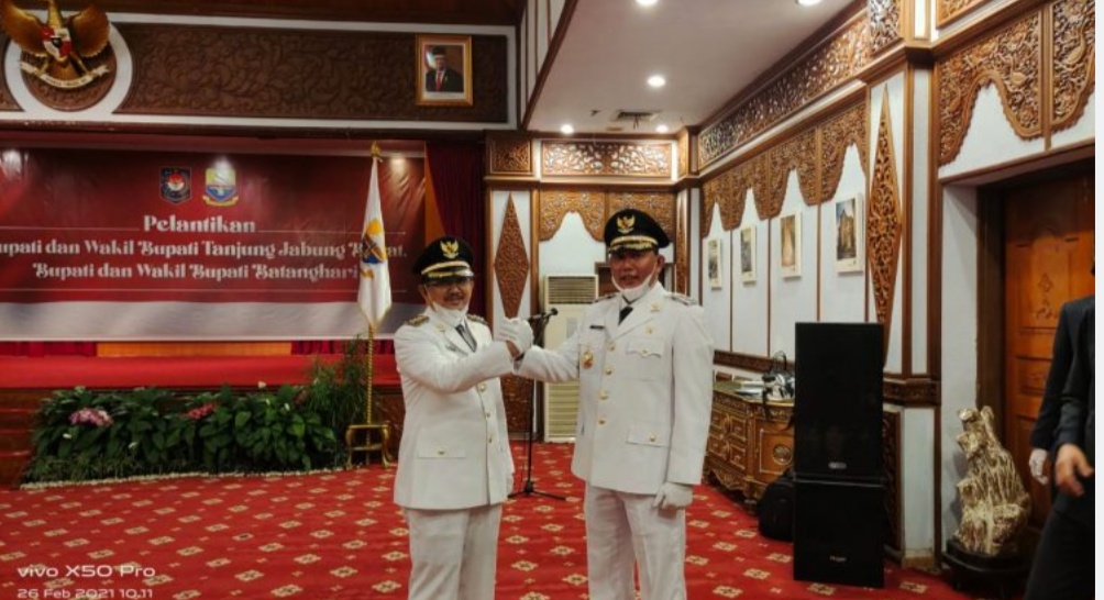 Pelantikan ini dilaksanakan secara virtual diruang rumah dinas gubernur Jambi, Jum’at pagi (26/02/2021). Dengan menerapkan protokol kesehatan. UAS – Hairan diambil sumpah untuk memimpin Kabupaten Tanjung Jabung Barat kedepan.
