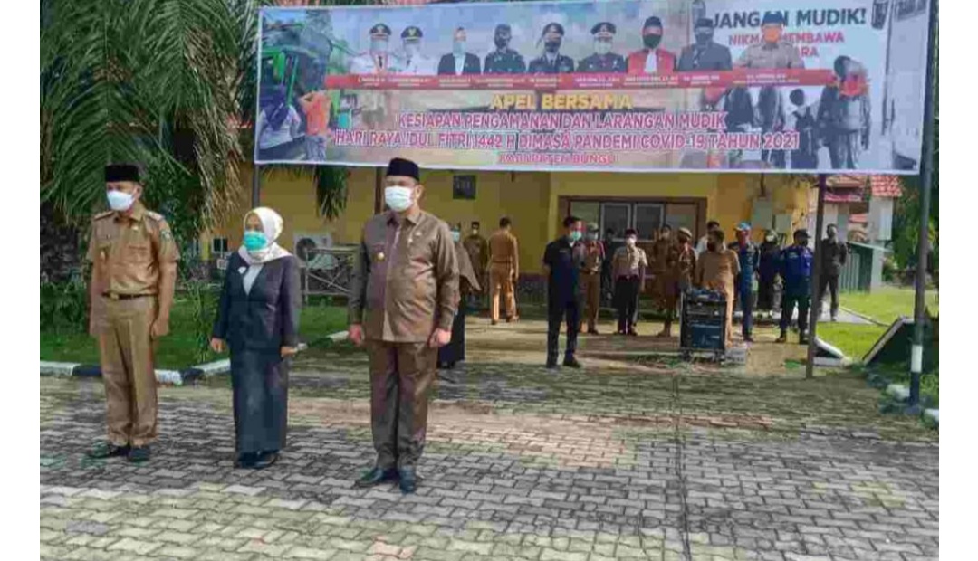 TOPIK BUNGO- Berdasarkan Surat Edaran menteri Dalam Negeri dan Gubernur Jambi tentang Larangan Mudik Di Hari Raya Idul Fitri 1442 H, Pemerintah Kabupaten Bungo menggelar Apel Bersama Kesiapan Pengamanan dan Larangan Mudik Hari Raya Idul Fitri 1442 H Dimasa Pandemi Covid19 Tahun 2021 yang laksanakan di Lapangan Upacara Kantor Bupati Bungo, Senin (26/04/2021).
