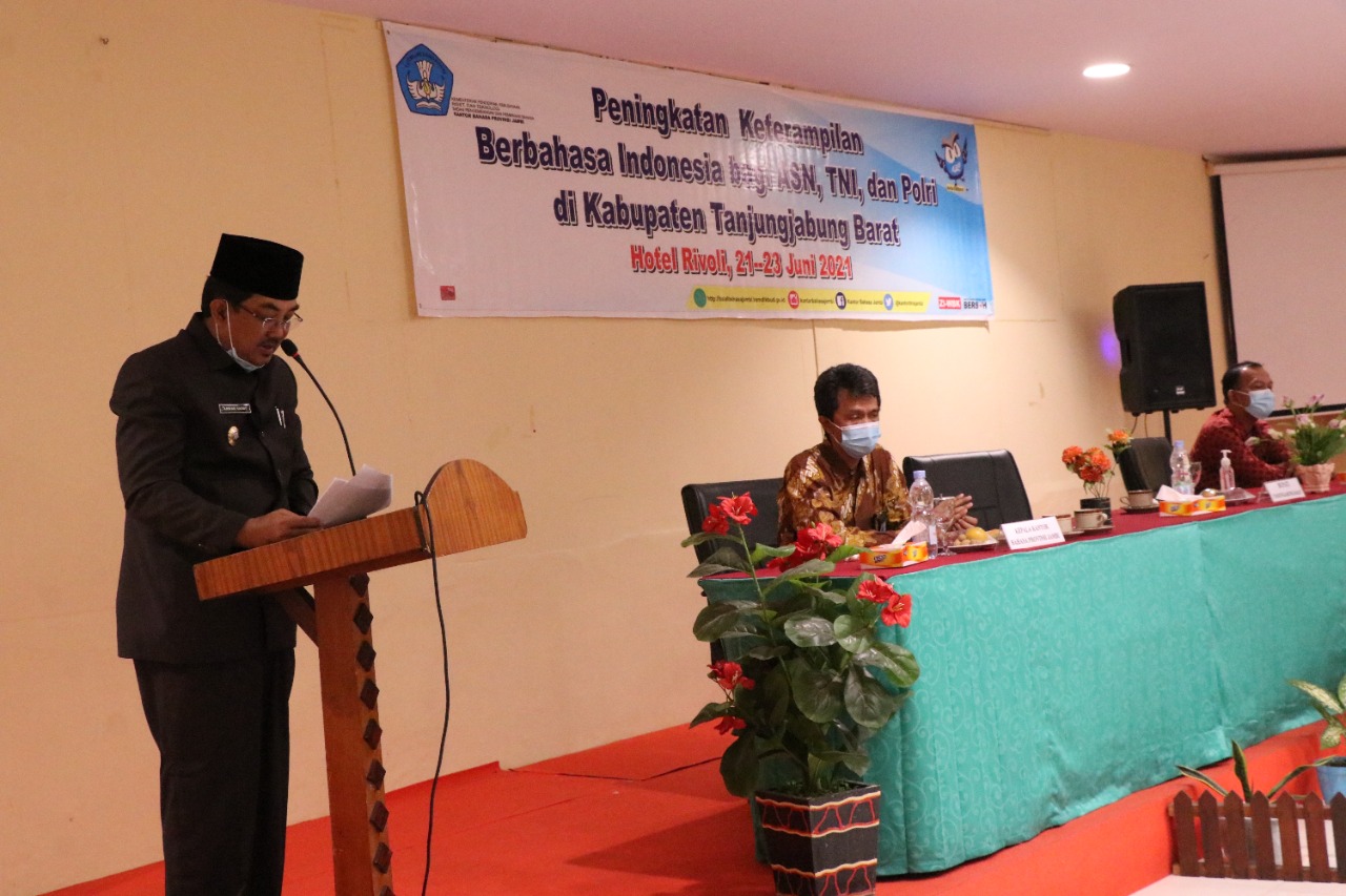 topikjambi.id,- Bupati Tanjung Jabung Barat Drs. H. Anwar Sadat, M.Ag Menghadiri sekaligus membuka acara peningkatan keterampilan Berbahasa Indonesia bagi TNI, Polri, Dan Asn kab. Tanjung Jabung Barat, Senin (21/06/21).