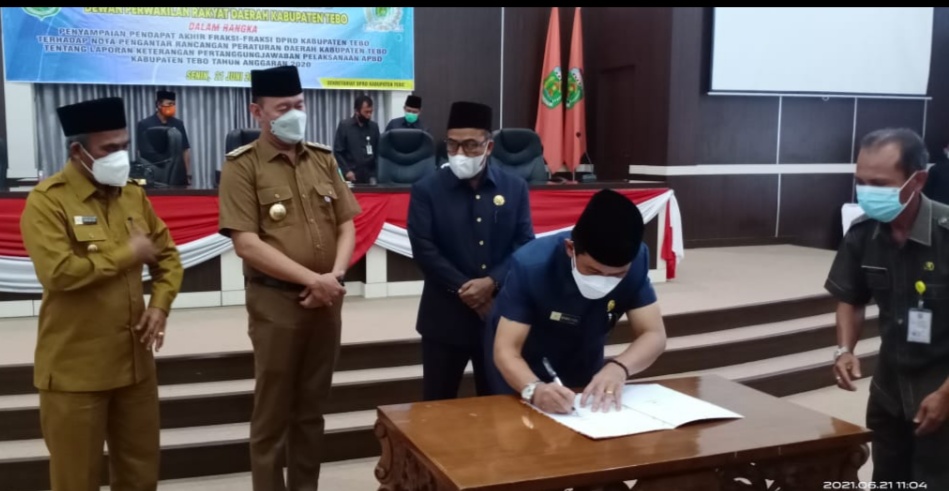 TOPIKJAMBI.ID-Muara Tebo, Dewan Perwakilan Rakyat Daerah (DPRD) kabupaten Tebo bersama pimpinan daerah menggelar sidang paripurna tentang penyampaian pendapat akhir fraksi-fraksi terhadap nota pengantar LKPJ pelaksanaan APBD kabupaten Tebo Tahun 2020.