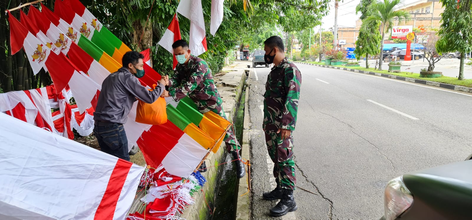 TOPIK BUNGO – Momentum Hari Ulang Tahun (HUT) RI Ke-76 Tahun. Kodim 0416/Bute bagikan sembako kepada para penjual bendera, kaum kaum dhuafa yang dibagikan oleh Kasdim Mayor Inf Herman Nurdali, dan Pasilos Kodim Bute, Selasa (17/08/2021).