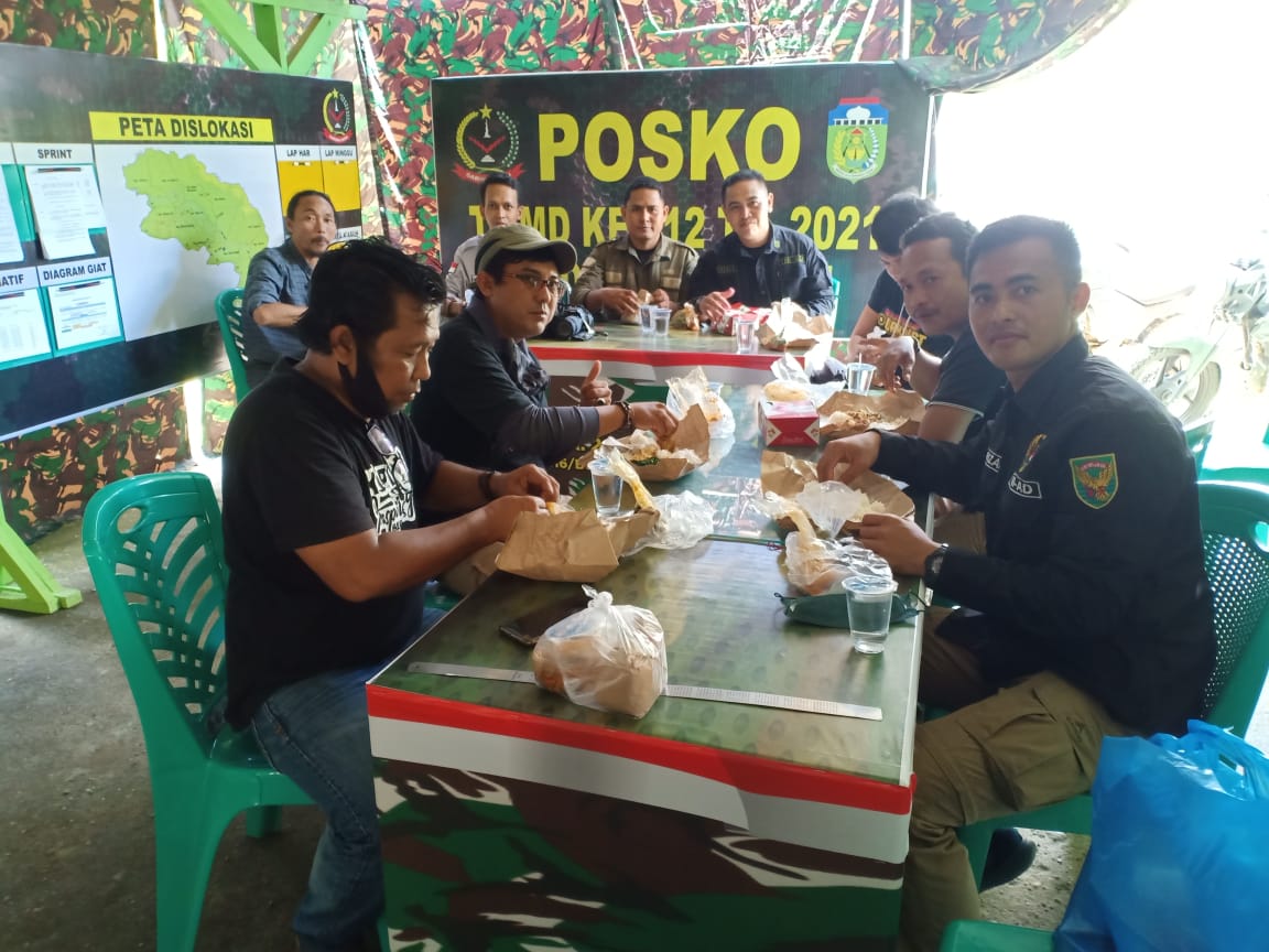 TEBO – Sejumlah wartawan liputan wilayah Tebo – Bungo makan siang bersama prajurit Kodim 0416/Bute, di Makoramil 416-03/Sungai Bengkal, Rabu (15/09/2021).