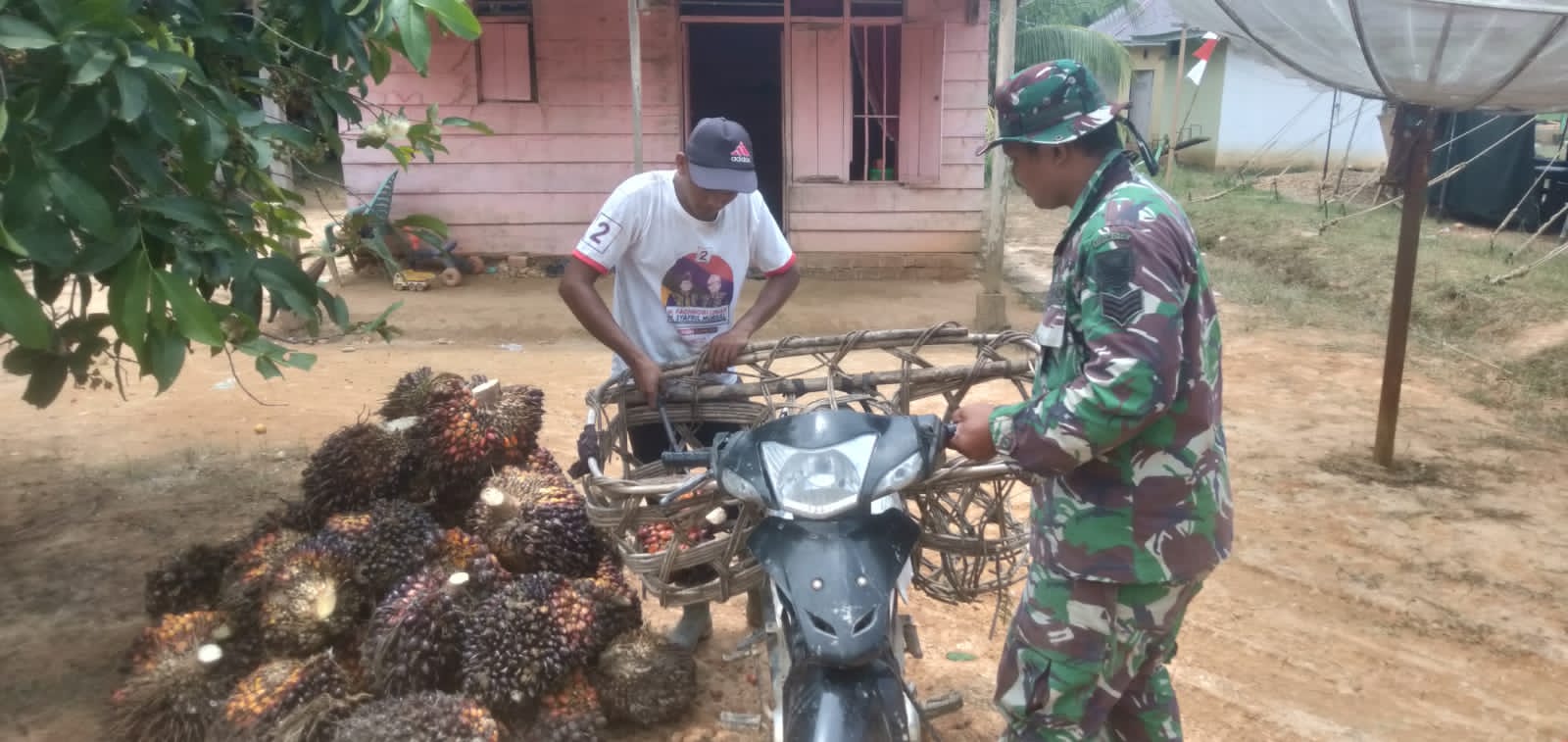TEBO –  Tak kenal lelah setelah bekerja satgas TMMD ke-112 Kodim 0416 Bungo Tebo, Serka Pracoyo bantu bapak asuh Suardi memasukan buah sawit ke dalam keranjang untuk dibawa ke tengkulak, Sabtu (09/10/2021).