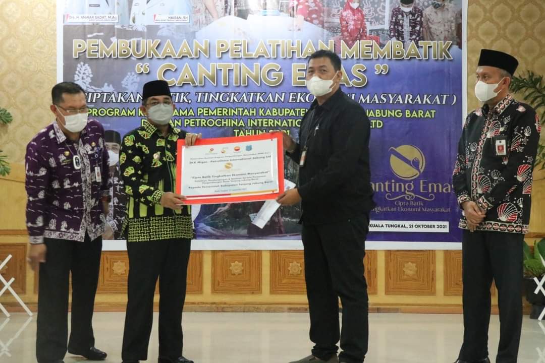topikjambi.id,- Bupati Kabupaten Tanjung Jabung Barat Drs. H.Anwar Sadat, M.Ag menghadiri sekaligus membuka acara Pelatihan Membatik bertajuk CANTING EMAS (Ciptakan Batik, Tingkatkan Ekonomi Masyarakat ) program kerjasama Pemerintah Kabupaten Tanjung Jabung Barat dengan Petrochina International Jabung LTD Tahun 2021. Kamis (21/10).