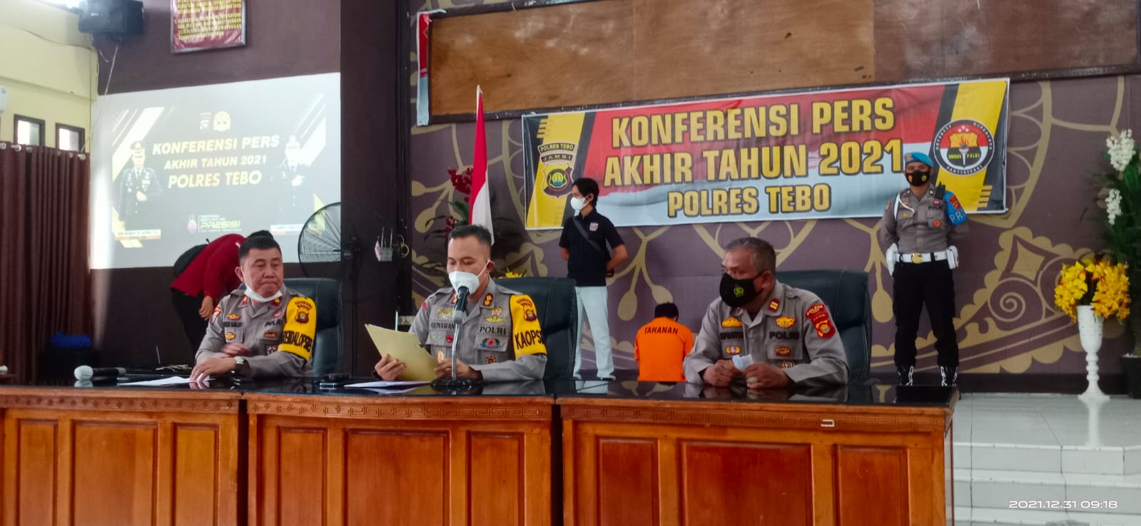 Kapolres Tebo AKBP Gunawan Trilaksono menyampaikan laporan kriminalitas yang di terima Polres Tebo selama tahun 2021 yaitu kasus tindak pidana CURAT. Sedangkan kasus tindak pidana kriminal khusus yang di selesaikan yaitu kasus Illegal Mining.