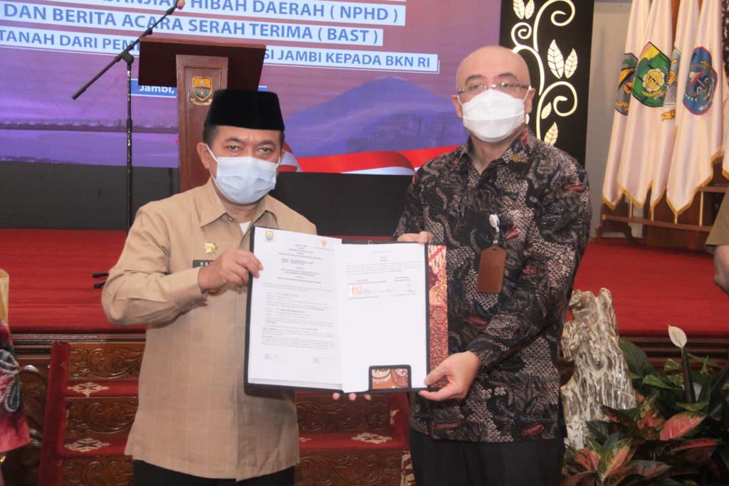 Jambi– Gubernur Jambi, Dr.H.Al Haris,S.Sos.,M.H., menyatakan, hibah tanah dari Pemerintah Provinsi Jambi kepada Badan Kepegawaian Nasional (BKN) RI merupakan wujud sinergitas yang baik dalam melaksanakan program pelayanan kepegawaian dan pembangunan sumber daya manusia. Hal tersebut dinyatakan Al Haris pada Penandatanganan Nota Perjanjian Hibah Daerah (NPHD) dan Berita Acara Serah terima (BAST) Hibah Tanah dari Pemerintah Provinsi Jambi Kepada BKN RI, bertempat di Auditorium Rumah Dinas Gubernur Jambi, Selasa (18/01/2022).