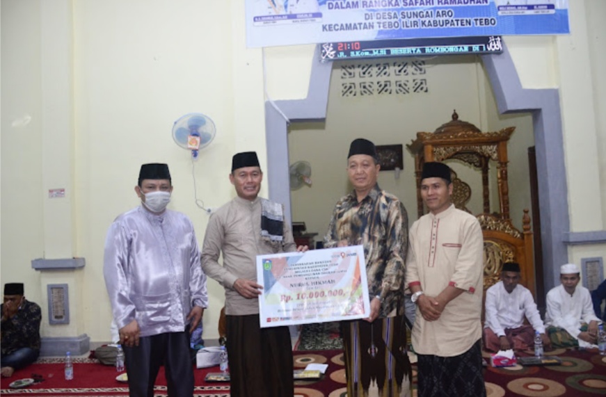 TOPIK TEBO- Bupati Tebo Dr. H. Sukandar S. Kom. M. Si. didampingi Wakil Bupati Syahlan S. H. melanjutkan kegiatan Safari Ramadan 1443 H di Masjid Islamic Center Nurul Hikmah Desa Sungai Aro Kecamatan Tebo Ilir, Rabu (06/04/2022).