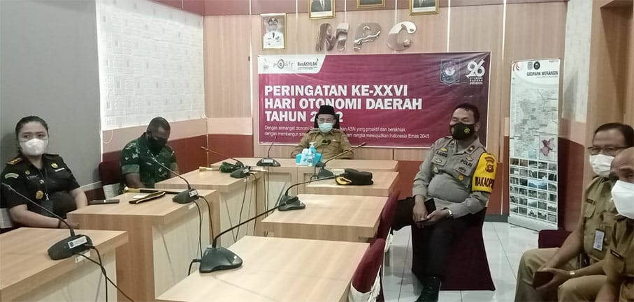 Peringatan HUT Otonomi Daerah ke XXVI kali ini bertema ‘Dengan semangat otonomi kita wujudkan ASN yang proaktif dan berakhlak dengan membangunkan sinergi pusat dan daerah dalam rangka mewujudkan Indonesia Emas 2045’.(Tj)