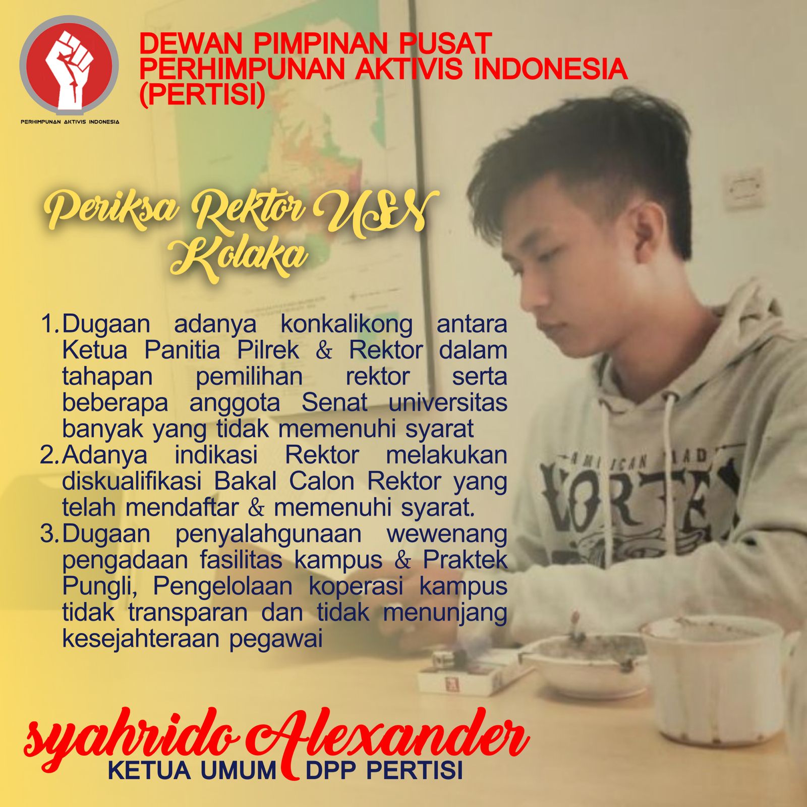 Ketua Umum Dewan Pimpinan Pusat Perhimpunan Aktivis Indonesia (DPP Pertisi) Syahrido Alexander saat di hubungi melalui sambungan telponnya Kamis 12 Mei 2022 mengatakan bahwa Perhimpunan Aktivis Indonesia mendapati laporan adanya praktek konspirasi antara Rektor USN Kolaka Dr. Azhari bersama panitia Pemilihan Rektor untuk menggagalkan Pemilihan Rektor USN Kolaka