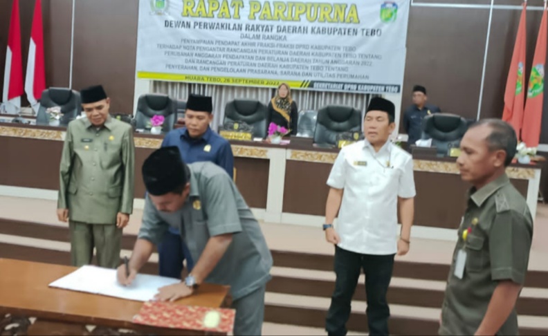 Muara Tebo,- Dewan Perwakilan Rakyat Daerah kabupaten Tebo menggelar rapat paripurna dalam rangka Penyampaian pendapat akhir fraksi-fraksi DPRD Tebo terhadap nota pengantar rancangan peraturan kabupaten Tebo tentang perubahan anggaran pendapat dan belanja daerah tahun 2022 dan rancangan peraturan daerah kabupaten Tebo tentang penyerahan dan pengelolaan prasarana, sarana dan utilitas perumahan 26 September 2022.