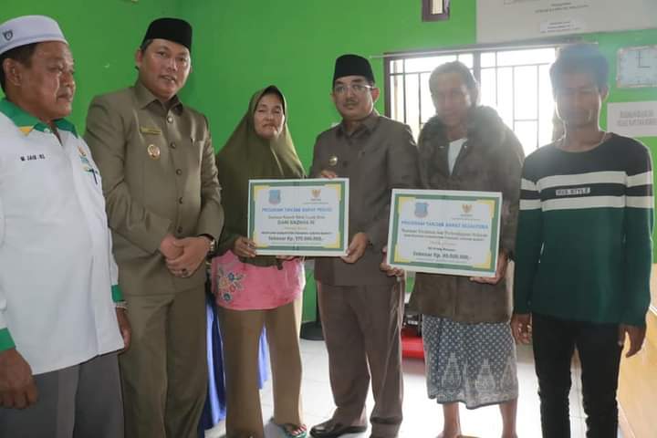 Kualatungkal,- Bupati Tanjung Jabung Barat, Drs. H. Anwar Sadat, M. Ag, didampingi Wakil Bupati, H. Hairan, SH, serahkan bantuan kepada nelayan sekaligus Launching kegiatan penyaluran bantuan UMKM Baznas dan bantuan RTLH dari Baznas Pusat, Senin (21/11).