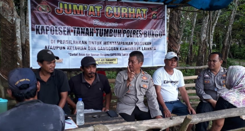 TOPIK BUNGO,- Kapolsek Tanah Tumbuh AKP. Adi Ismanto beserta jajaran melaksanakan Jumat Curhat di Kampung Ilir dusun Lubuk Niur kecamatan Tanah Tumbuh Jumat 10 Maret 2023.