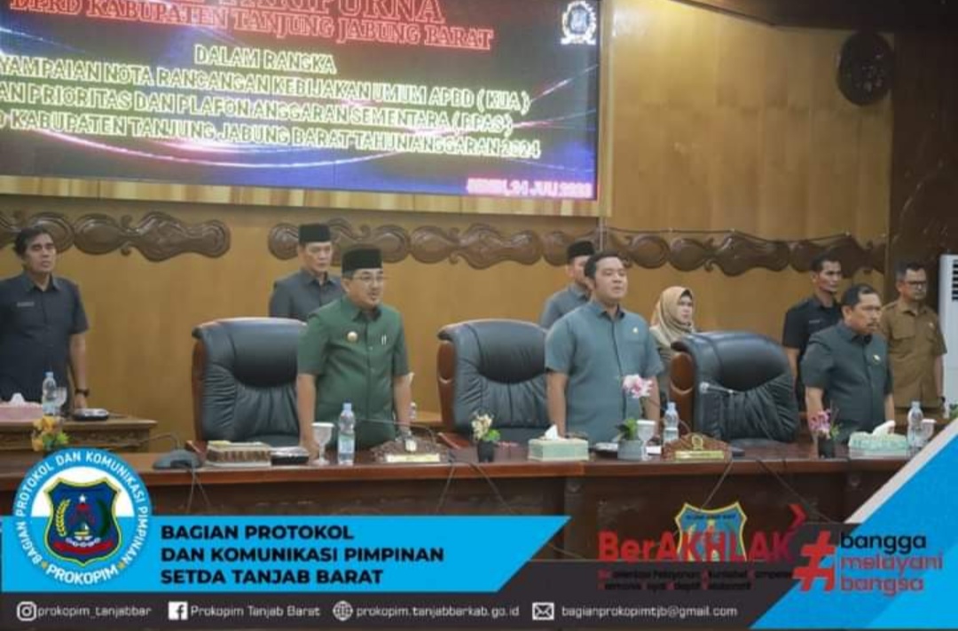 Penyampaian KUA dan PPAS disampaikan pada rapat paripurna DPRD yang digelar di Ruang Rapat Paripurna DPRD Kab. Tanjab Barat dipimpin langsung oleh Wakil Ketua I DPRD, Ahmad Jahfar, SH serta dihadiri Ketua DPRD, Para anggota DPRD, Sekretaris Daerah, Unsur Forkopimda, Asisten dan Staf Ahli, Kepala OPD, Para Kabag dan Insan Pers.