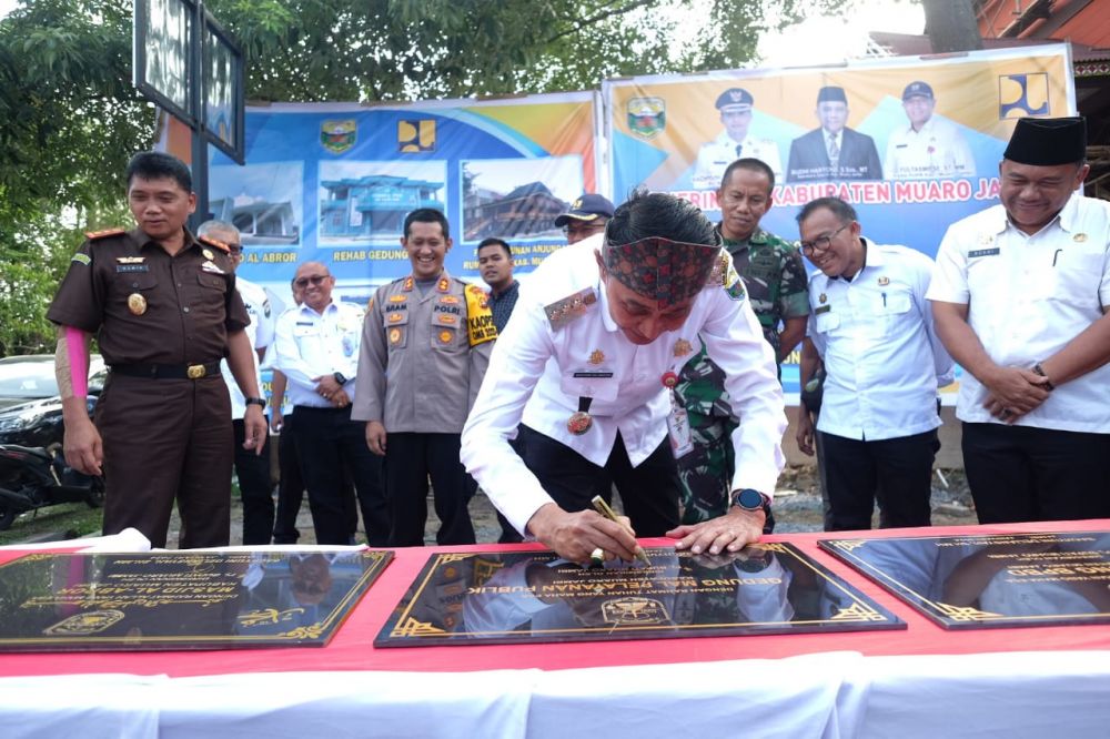 MUAROJAMBI-Pj Bupati Muaro Jambi Bachyuni Deliansyah meresmikan enam gedung yang dibangun oleh Pemerintah Kabupaten Muaro Jambi.