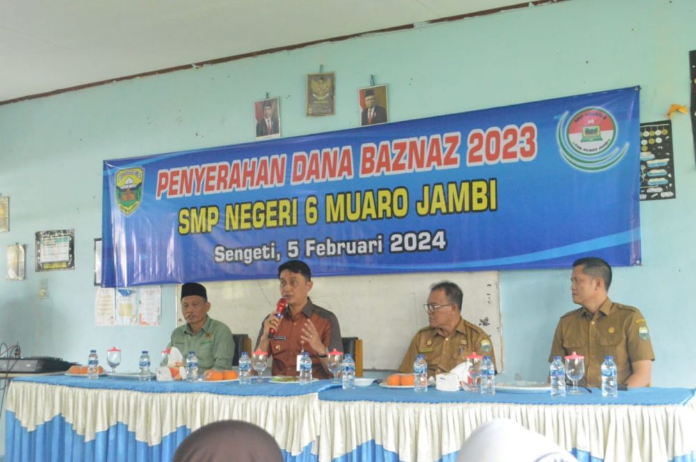 MUAROJAMBI-Penjabat Bupati kabupaten Muaro Jambi Bahcyuni Deliansyah menghadiri ‘Penyerahan Dana Baznas’ di SMP 6 Sengeti kabupaten Muaro Jambi, Senin (5/02/2024).