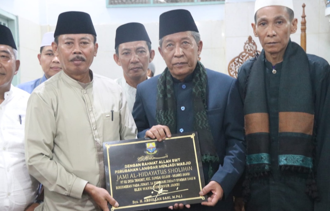Sungai Gelam – Wakil Gubernur Jambi Drs. H. Abdullah Sani, M.Pd.I meresmikan status perubahan langgar menjadi Masjid Jami’ Al Hidayatussholihin Kebun Kolim Desa Tangkit Kecamatan Sungai Gelam Kabupaten Muaro Jambi. Hal tersebut dilaksanakan pada acara memperingati Isra’ Mi’raj Nabi Muhammad sekaligus peresmian langgar menjadi masjid Jami’ Al Hidayatussholihin, Jum’at (16/02/2024) malam.
