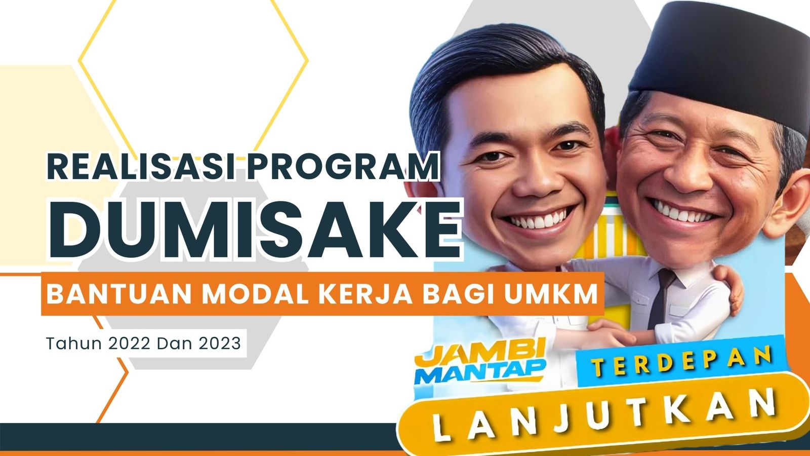 Bantuan modal kerja yang merupakan bagian realisasi dari Dumisake Jambi Mantap ini nilainya mencapai Rp 37,280 Miliar. Dibagikan selama 2 tahun berturut, dimana tahun 2022 dengan realisasi Dumisake UMKM sebesar Rp 19,330 miliar dan tahun 2023 dengan realisasi Rp. 17,950 miliar.