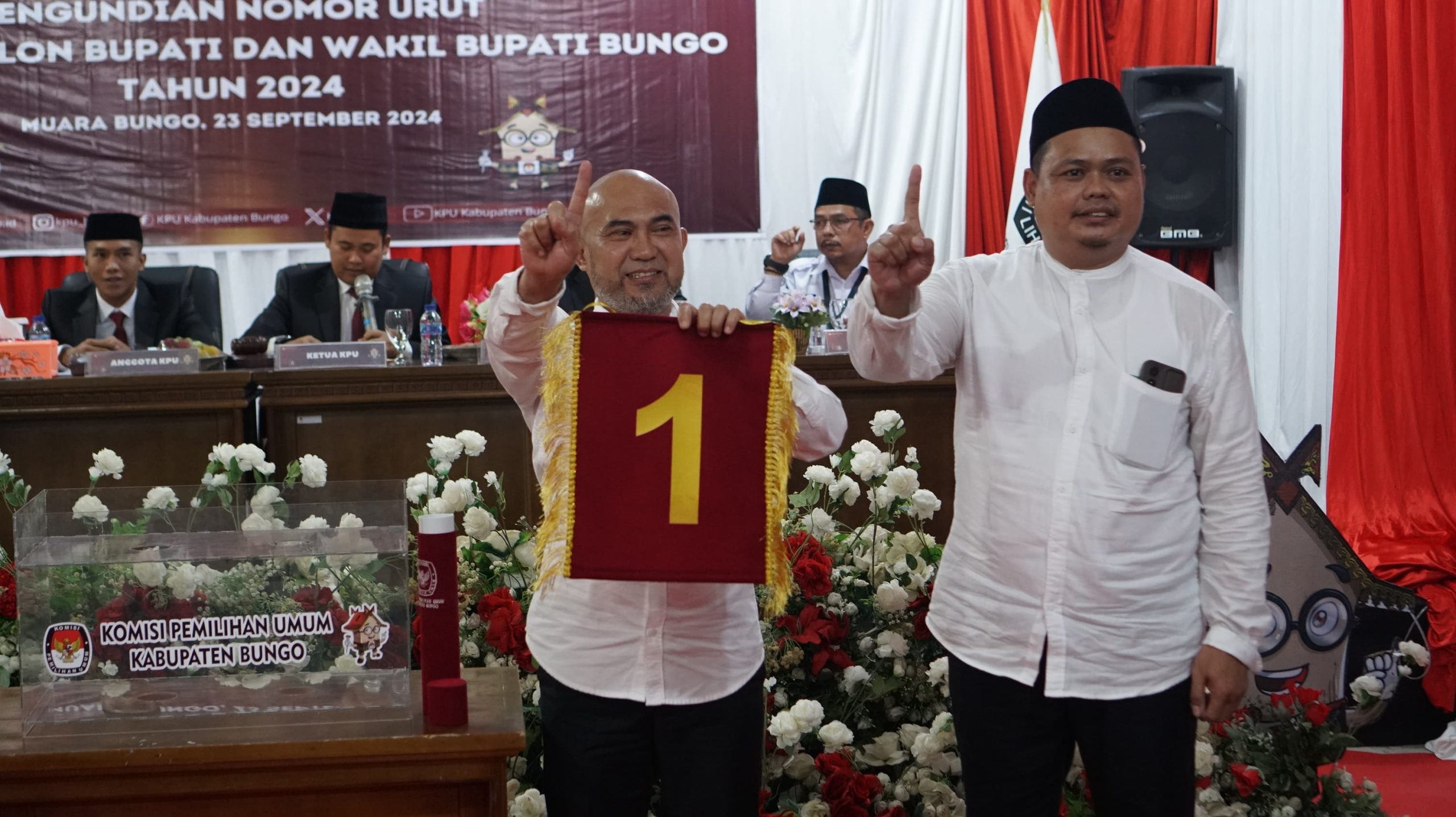 Pasangan Dedy-Dayat mengambil langsung undian yang di siapkan oleh KPU dan pasangan yang mengusung Visi Bungo Baru ini mendapatkan nomor urut satu (1).
