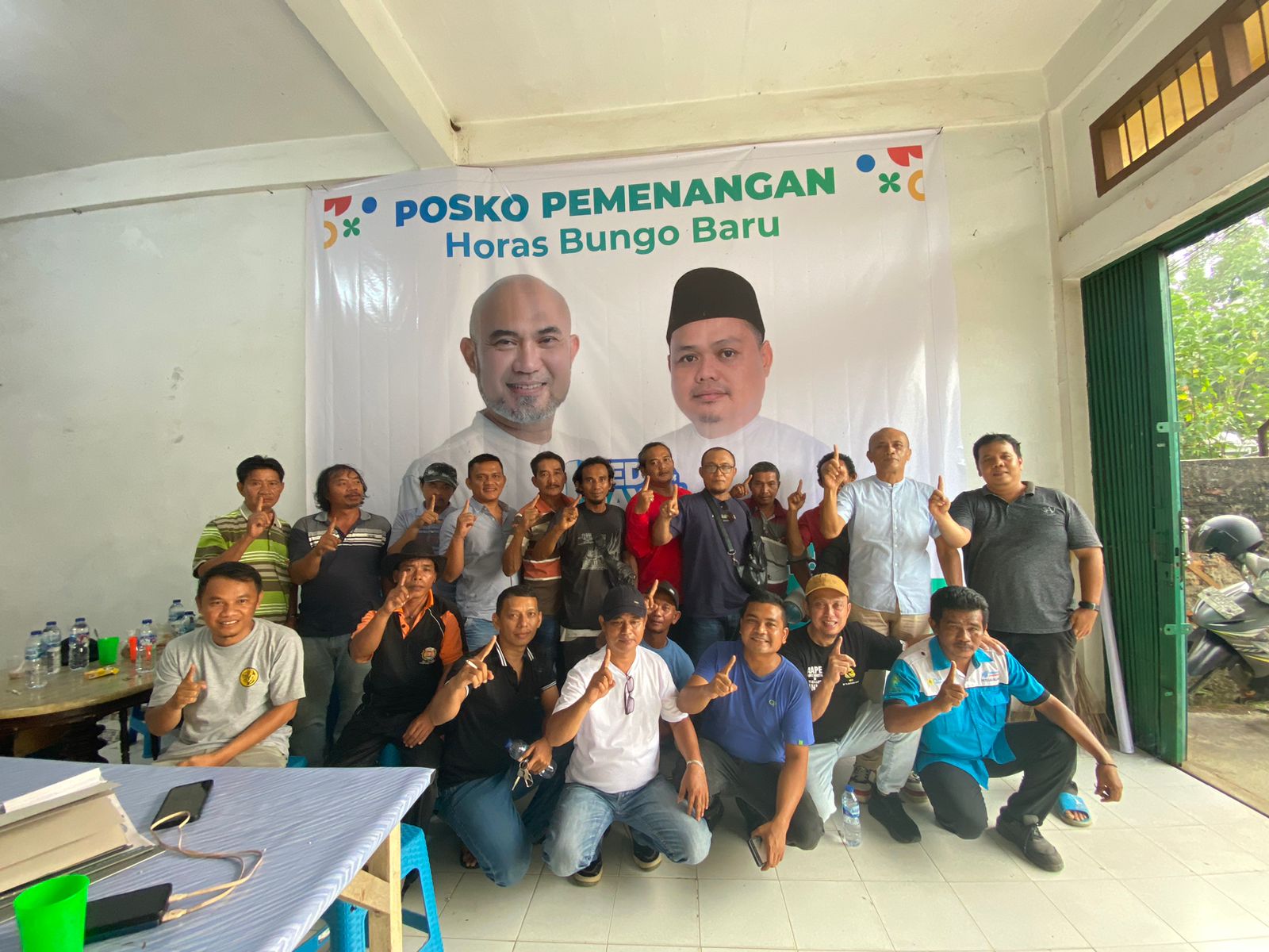 Muara Bungo – Relawan Horas Bungo menyambut kedatangan perwakilan dari pasangan nomor urut 01, Dedy-Dayat di posko Horas Bungo Baru, Sungai Kerjan, Sabtu (19/10/2024).
